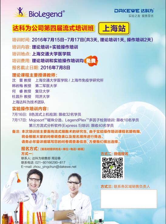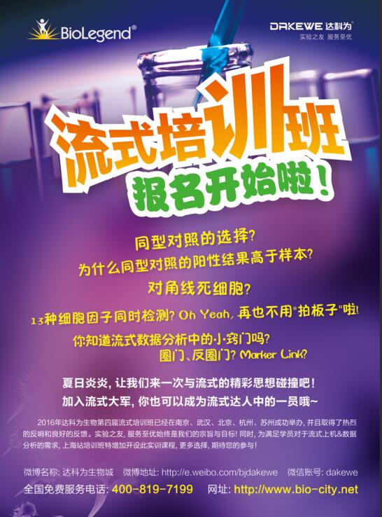 2016年達(dá)科為生物第四屆流式培訓(xùn)班已經(jīng)在全國各地火熱舉辦中,第七站上海培訓(xùn)班經(jīng)過前期的彩頁、海報的宣傳,報名工作已經(jīng)接近尾聲。目前上機(jī)課程已滿,理論課程還有部分名額,感興趣的學(xué)員,歡迎報名,期待您的參與!