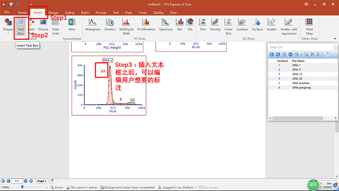 b.將細(xì)胞周期分析的模板調(diào)出來之后,點擊OK,會彈出如下圖所示的界面,然后可以利用insert按鈕,插入文本框,從而可實現(xiàn)圖注的編輯,如下圖所示(我們可以對圖中的每個峰進行命名,從而可以對細(xì)胞周期中的各個時期進行命名和解釋):