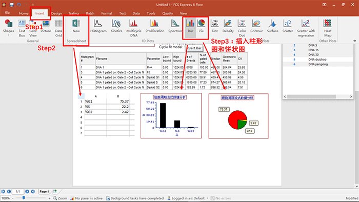 a.舉例,對細(xì)胞周期中G1期,S期及G2期各細(xì)胞比列的情況分析并做成柱形圖及餅狀圖,直接插入Spreadsheets,然后將相應(yīng)的數(shù)據(jù)拖拽入表格中,點擊insert命令按鈕,插入相應(yīng)的柱形圖和餅狀圖,操作如下: