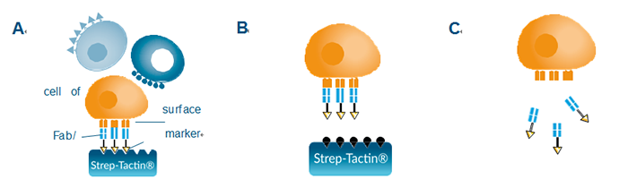Streptamer?涵蓋了從細胞分選、細胞擴增到細胞染色的一系列完整細胞研究產(chǎn)品線。事實上,Streptamer?的這種可逆機制是依賴于IBA專利的Strep-tag?技術,從而經(jīng)過多重陽性分選,可獲得用于后期擴增或染色的目的細胞。