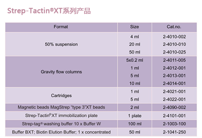 Strep-tag?是IBA lifesciences基于生物素(Biotin)和鏈霉親和素(Streptavidin)之間的結合反應開發(fā)的蛋白純化系統(tǒng)。第三代Strep-tag?系統(tǒng):「Strep-Tactin?XT:Twin-Strep-tag?」蛋白純化系統(tǒng),其結合力可達pM級別但仍保持結合的可逆性和固定化蛋白的溫和復蘇能力。因此,用Strep-Tactin?XT系統(tǒng)能有效提高您目標蛋白的純度,解決您實驗中所遇到的常見問題。