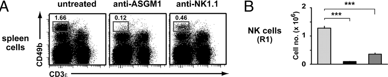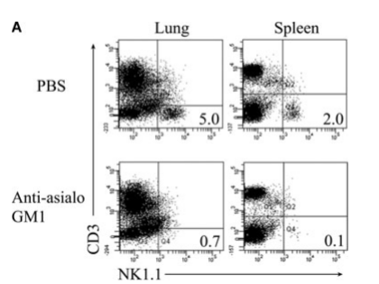 文獻(xiàn)來(lái)源:Zhou G, et al. 2013. Eur. J. Immunol. 43:929. 該圖顯示尾靜肪注射anti-asialo GM1或PBS,每五天一次,不管是肺還是脾臟,都顯示出NK細(xì)胞消耗率。