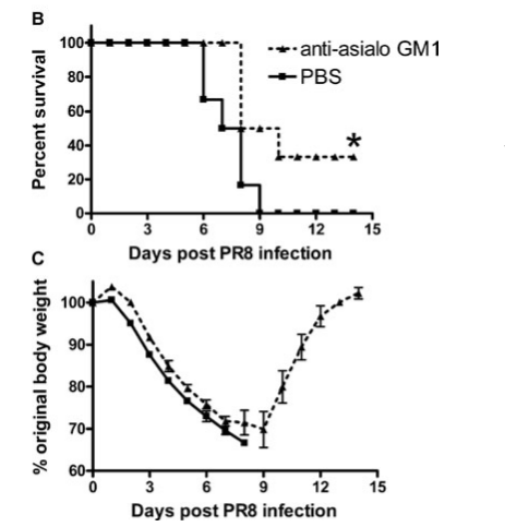 文獻(xiàn)來(lái)源:Zhou G, et al. 2013. Eur. J. Immunol. 43:929. 該圖顯示尾靜肪注射anti-asialo GM1或PBS,同時(shí)用流感病毒處理,并且每天監(jiān)測(cè)小鼠存活率(B)和小鼠體重(C)。顯示,消耗NK細(xì)胞增加流感病毒感染小鼠的致病率和致死率。
