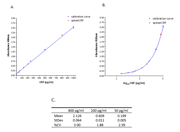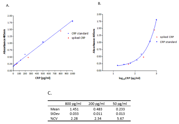 計算:擬合標(biāo)準(zhǔn)曲線,通過測量吸光度來確定添加到板中的樣品的CRP濃度。