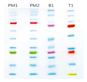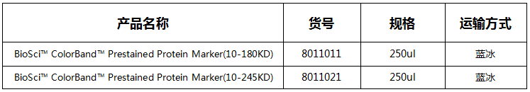 BioSciTM ColorBandTM Prestained Protein Marker產(chǎn)品應(yīng)用于SDS-PAGE凝膠電泳時(shí),可實(shí)時(shí)監(jiān)測(cè)蛋白樣品的分離情況,也可以用于評(píng)估Western轉(zhuǎn)膜(PVDF、尼龍或硝酸纖維素膜)效率,并粗略的估計(jì)蛋白樣品的分子量。