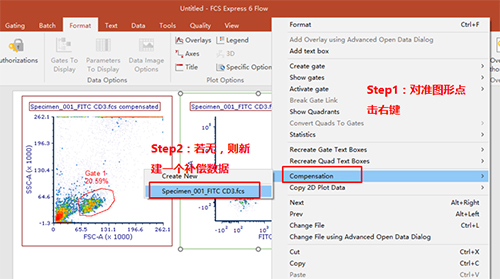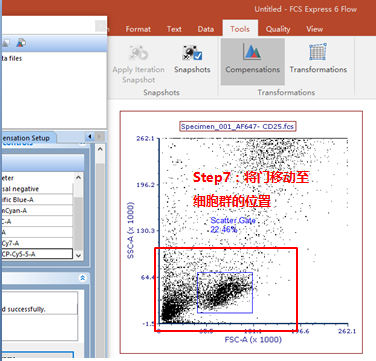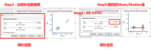 此時可以手動調(diào)節(jié)兩通道之間的補(bǔ)償,該數(shù)據(jù)為FITC單管,可用PE-FITC調(diào)節(jié)FITC滲漏到PE通道去的熒光。步驟如下圖所示: