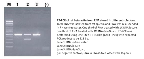 將RNA-SafeGuard Reagent (20X)用滅菌水稀釋成1X濃度,65°C反應(yīng)20分鐘滅活水中、瓶中的RNase。剩余的1X RNA保存液