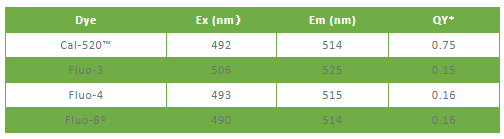 Fluo-3和Fluo-4是常用的可見光激發(fā)的Ca2+指示劑,然而Fluo-3AM和Fluo-4 在體內結合鈣離子后的熒光強度不高,需要比較苛刻的loading condition來加強熒光強度。AAT Bioquest?Fluo-8改善了二者的loading condition和熒光強度問題,比如Fluo-8只需要在室溫孵育,而Fluo-3和Fluo-4需要37度水浴,另外Fluo-8的熒光強度是Fluo-4的兩倍,是Fluo-3的4倍,另外Fluo-8依舊保持Fluo-3和Fluo-4的通道。