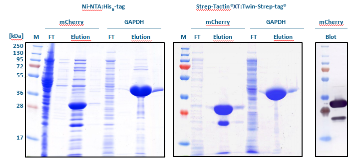 以SDS-PAGE分析發(fā)現(xiàn),不管是mCherry或是GAPDH,使用Strep-tactin? XT: Twin-Strep-tag?都能得到純度較高的目標蛋白(見Elution)。Western Blot分析結(jié)果顯示,提取mCherry所出現(xiàn)的雜質(zhì)為其降解產(chǎn)物。