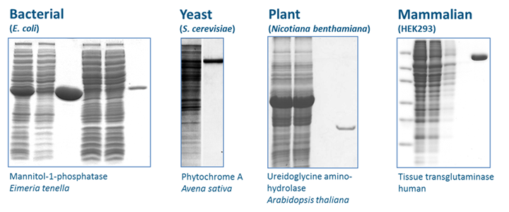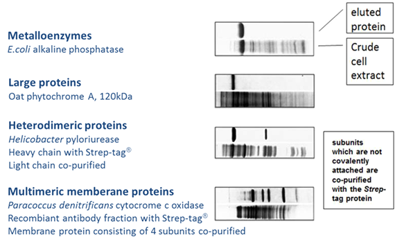 因His-tag系統(tǒng)使用Ni離子,所以在純化金屬蛋白(多數(shù)為酶)時,可能會受到金屬間交互作用的干擾。而使用Strep-tag? 則不會出現(xiàn)此問題,因為Strep-Tactin? XT與Strep-tag?的特異性結(jié)合不受金屬離子影響。且因其溫和的純化流程,所以還能用于純化大型蛋白、多亞基的蛋白復(fù)合體或是跨膜蛋白,并且保持蛋白功能。以Strep-tag?系統(tǒng)純化出不同的蛋白實例如下: