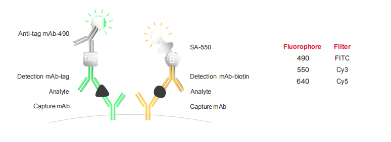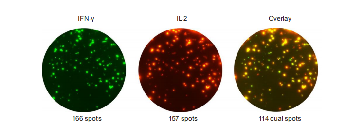 FluoroSpot能夠分析抗原特異性的多功能T細胞,例如,IFN-γ和IL-2的分析。三明治夾心結(jié)構(gòu)在熒光斑點中得以應用,不同特異性的單克隆捕獲抗體混合物被包被于96孔板的PVDF膜上,生物素標記的檢測抗體識別一種分泌物,tag標記的檢測抗體識別其它的分泌物來實現(xiàn)雙色或三色細胞因子分泌細胞的檢測。檢測通過帶有特定熒光基團的共軛試劑放大信號斑點,可用自動讀板器進行分析。