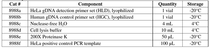 引物不含非特異性擴增。每個引物組均已經(jīng)通過PCR和凝膠電泳驗證了擴增特異性。該試劑盒靈敏度高,可以檢測低至20個 HeLa細胞/百萬細胞。