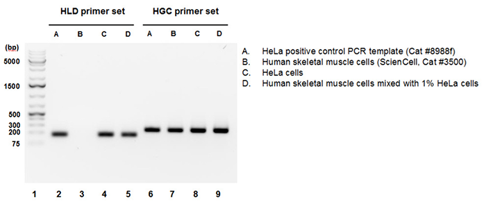 HeLa基因組DNA(gDNA)檢測引物組分(HLD)識別并擴增基因組中不存在于其他人類細胞的HeLa細胞特異性序列。