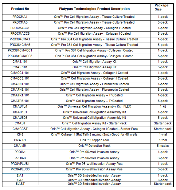 美國(guó)Platypus Technologies公司建立于2000年,是細(xì)胞分析領(lǐng)域產(chǎn)品的耗材供應(yīng)商,熱賣產(chǎn)品為OrisTM和OrisTM Pro系列細(xì)胞遷移和侵襲實(shí)驗(yàn)試劑盒。其開發(fā)的用于檢測(cè)細(xì)胞遷移和侵襲的細(xì)胞排斥區(qū)分析法,克服了Transwell和劃痕實(shí)驗(yàn)的缺點(diǎn)。