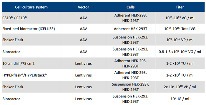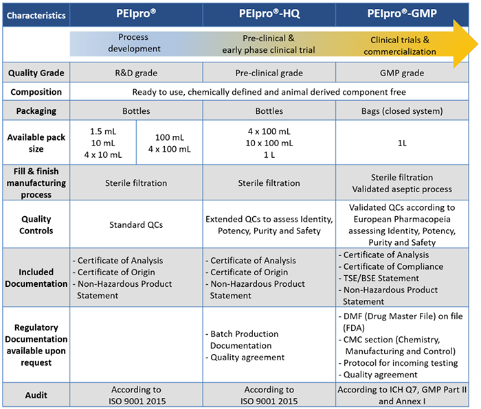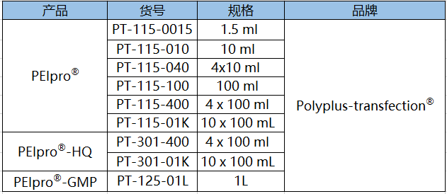 表1.Polyplus-transfection?提供一系列不同級別PEIpro?,滿足從工藝開發(fā)、臨床前、到臨床級別病毒載體的生產需求