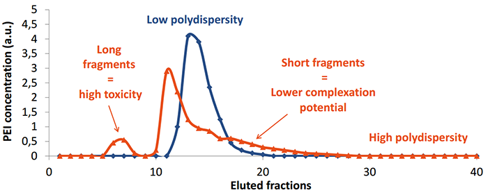 由于長片段的PEI對細胞有毒性,而短片段PEI結合DNA能力較差(見紅色),所以優(yōu)化PEI的片段大小,降低其分散性能減少細胞毒性,同時增加結合DNA的能力(見藍色)和轉染重復性。