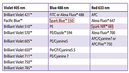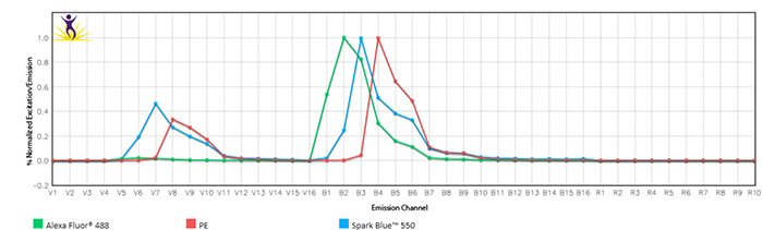 Spark Blue?550被488nm藍(lán)色激光激發(fā)并在550nm處發(fā)射,介于AlexaFluor?488或FITC和PE的峰值發(fā)射之間。SparkBlue?550的亮度與FITC相當(dāng)。405nm紫外激光可以進(jìn)一步增加這幾種熒光不互相混合的情況。