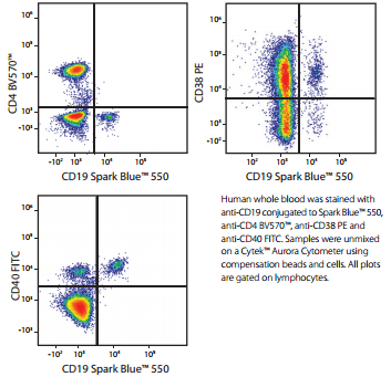 使用抗CD19-Spark Blue?550與CD4-BV570?、CD38-PE以及CD40-FITC等不同組合抗體對人全血進(jìn)行染色。圖中數(shù)據(jù)均來至于淋巴細(xì)胞門。結(jié)果可以看出SparkBlue?550可以完全與FITC和PE熒光區(qū)別開,該數(shù)據(jù)使用Cytek?Aurora流式儀檢測。