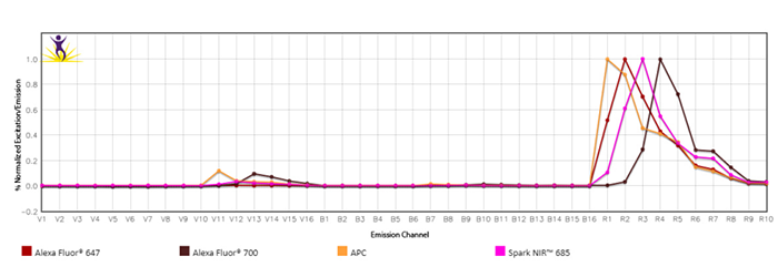 由于近紅外(NIR)范圍內(nèi)的熒光發(fā)射光譜以及光電倍增管(PMT)對800nm以上發(fā)射波長的不敏感性,633nm紅色激光器僅限于2-3個熒光。借助全光譜流式細(xì)胞儀,APC和AlexaFluor?700的發(fā)射峰之間的光譜間隙可檢測Spark NIR?685等新型熒光。Spark NIR?685可被633 nm激發(fā),最大發(fā)射波長為685 nm,與FITC具有相似的亮度。