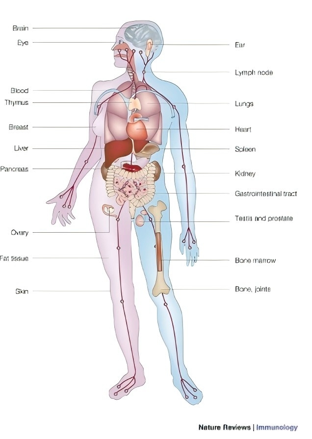 起初,T 細(xì)胞被認(rèn)為是免疫系統(tǒng)中 MIF 的主要細(xì)胞來(lái)源。然而,后來(lái)的文獻(xiàn)證明了單核細(xì)胞、巨噬細(xì)胞、血液中的樹(shù)突狀細(xì)胞、B 細(xì)胞、中性粒細(xì)胞、嗜酸性粒細(xì)胞、肥大細(xì)胞和嗜堿性粒細(xì)胞均表達(dá)MIF。值得注意的是,MIF 也由與宿主自然環(huán)境直接接觸的細(xì)胞和組織表達(dá),例如肺、皮膚上皮層以及胃腸道和泌尿生殖道。其另一個(gè)顯著特征是在內(nèi)分泌系統(tǒng)的幾個(gè)組織中高水平表達(dá),尤其是參與應(yīng)激反應(yīng)的器官(下丘腦、垂體和腎上腺)。