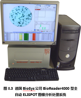 德國(guó)Bio-Sys公司從上世紀(jì)80年代開(kāi)始就致力于生物圖像識(shí)別領(lǐng)域,在進(jìn)入ELISPOT圖像分析儀市場(chǎng)后一直以其先進(jìn)的ELISPOT斑點(diǎn)識(shí)別技術(shù)聞名。德國(guó)Bio-Sys公司首先解決了顯微攝像系統(tǒng)難以定位96孔板上的每一個(gè)孔的問(wèn)題。其解決方法基于圖像識(shí)別技術(shù),利用板孔邊壁和真正的孔底的細(xì)微差別,在機(jī)械定位的基礎(chǔ)上,通過(guò)軟件識(shí)別來(lái)進(jìn)一步提高每孔的定位精度。是目前市場(chǎng)上所有ELISPOT圖像分析儀中唯一能夠完整識(shí)別整個(gè)孔底ELISPOT斑點(diǎn)圖像的設(shè)備。在對(duì)真假斑點(diǎn)的分辨中,德國(guó)Bio-Sys公司除了具備完善的物理學(xué)多參數(shù)識(shí)別技術(shù),還特別針對(duì)ELISPOT斑點(diǎn)形成的生物學(xué)過(guò)程,通過(guò)細(xì)胞因子顯色后的“光密度”峰值積分分析方法,精確分辨真假斑點(diǎn)、融合斑點(diǎn)等復(fù)雜情況。Bioreader系列ELISPOT圖像分析儀國(guó)外大多數(shù)較有經(jīng)驗(yàn)的ELISPOT實(shí)驗(yàn)室推崇的特點(diǎn)為:專業(yè)性和參數(shù)全開(kāi)放性。因?yàn)镋LISPOT實(shí)驗(yàn)的復(fù)雜性,ELISPOT斑點(diǎn)形成在不同的實(shí)驗(yàn)條件下有非常大的差異。這就對(duì)ELISPOT圖像分析儀提出了較高的要求:既要能夠保證斑點(diǎn)計(jì)數(shù)的真實(shí)性和一致性,又要能夠根據(jù)不同情況,通過(guò)實(shí)驗(yàn)者的判斷來(lái)校正儀器對(duì)ELISPOT斑點(diǎn)識(shí)別的標(biāo)準(zhǔn)。要同時(shí)實(shí)現(xiàn)以上兩個(gè)要求,唯一的辦法是將儀器的所有判斷標(biāo)準(zhǔn)向ELISPOT實(shí)驗(yàn)者開(kāi)放,實(shí)現(xiàn)實(shí)驗(yàn)者和儀器的互動(dòng)。在這一方面,德國(guó)Bio-Sys公司始終走在ELISPOT斑點(diǎn)識(shí)別領(lǐng)域的前列,新的Bioreader-4000型(圖8.3)和Bioreader -5000(圖8.4) 型在專業(yè)性和適用性方面都領(lǐng)先于其他廠家的設(shè)備。