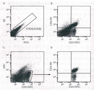 雖然死細胞位于散點圖的對角線上,但是對角線上的細胞確不一定是死細胞,因為雙陽性細胞如果在x軸和y軸的熒光信號相似時,也可以位于對角線上。所以,散點圖對角線上的細胞可能是死細胞,也可能是雙陽性細胞。如圖1-B所示,樣本細胞為正常小鼠脾臟細胞,標記 FITC-抗CD3抗體和PE-抗CD4抗體,F(xiàn)ITC和PE雙陽性的CD4 T細胞和死細胞混在一起,無法區(qū)分。但是死細胞和雙陽性細胞的形狀是不一樣的,死細胞呈現(xiàn)連續(xù)的線型分布,而雙陽性細胞群呈現(xiàn)圓形的群體分布,因此,可以從對角線上的細胞群體的形狀大致判斷細胞的性質。雖然不能根據熒光強度的強弱來區(qū)分該熒光信號是來自于死細胞的非特異性熒光還是來自熒光素產生的熒光,但是可以利用在散點圖上死細胞位于對角線的特點來區(qū)分死細胞和陽性活細胞。如圖1-C所示,x軸表示FITC通道(樣本細胞標記有FITC-抗CD3抗體),y軸表示APC通道(閑置通道),借用該散點圖可以明確區(qū)分圖1-B中無法區(qū)分的死細胞和雙陽性細胞。此時只需要將排除了死細胞后的CD3 T細胞設門,將門內的細胞顯示于新的FITC-PE散點圖中,如圖1-D,此時該散點圖內的細胞都是活細胞,因為樣本細胞同時標記有PE-抗CD4抗體,所以圖中的細胞明顯分為兩群,雙陽性的是CD4T細胞,單陽性的是CD8 T細胞。