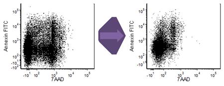 圖為:體外培養(yǎng)一天的C57BL/6小鼠脾細胞做Annexin V/7-AAD染色的流式數(shù)據。其中,左邊為未經固定處理的細胞上機檢測結果; 右邊為經過70%EtOH, 1.5%PFA固定處理的細胞上機檢測結果。