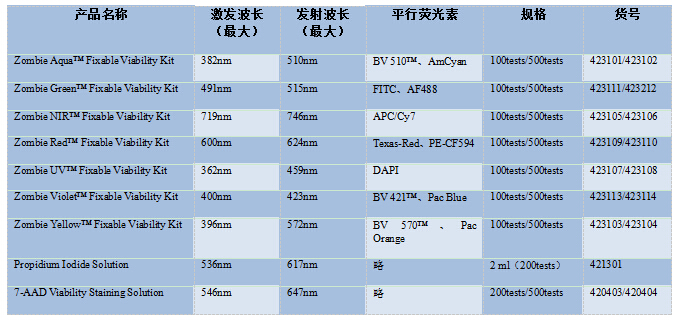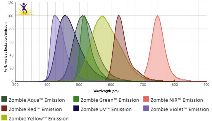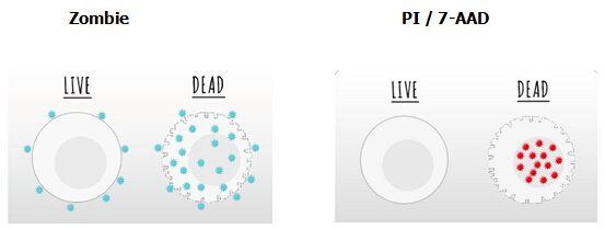 Zombie Dyes有別于PI和7-AAD等DNA染料,它是一種可用于需固定細胞實驗的染料,通過與細胞上蛋白質的氨基結合來實現(xiàn)。因活細胞可排除染料,所以僅細胞膜被著色;而死細胞的細胞膜及細胞質均被著色,繼而根據熒光信號的強弱來區(qū)分死/活細胞。而且Zombie Dyes可選擇性多,可以由不同的激發(fā)光激發(fā),便于靈活選擇。
