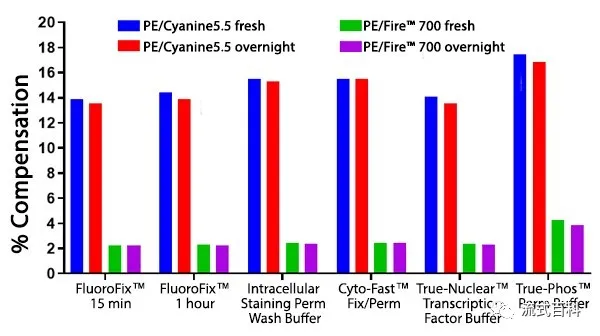 PE/Fire? 700 和PE/Cyanine5.5標記的兩種CD4抗體檢測人裂紅外周血,抗體孵育完成后在固定洗滌馬上去檢測條件下和過夜后的條件下,在5激光Cytek? Aurora 光譜流式平臺檢測,PE/Fire? 700 在不同的實驗方案中對多聚甲醛的固定具有穩(wěn)定的抗性,表現(xiàn)出比PE/Cyanine5.5更優(yōu)秀的穩(wěn)定性,但是在磷酸化指標的檢測方案中,PE/Fire? 700熒光素的穩(wěn)定性出現(xiàn)了一定程度的下降。
