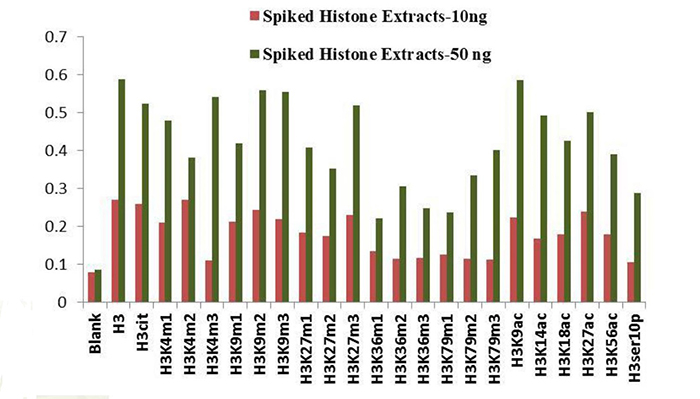 該試劑盒檢測H3修飾位點(diǎn):H3K4me1 、H3K4me2、H3K4me3、H3K9me1、H3K9me2 、H3K9me3、H3K27me1、H3K27me2、H3K27me3、H3K36me1、H3K36me2、H3K36me3、H3K79me1、H3K79me2、H3K79me3、H3K9ac、H3K14ac、H3K18ac、H3K56ac、H3ser10P、H3ser28P、TotalH3
